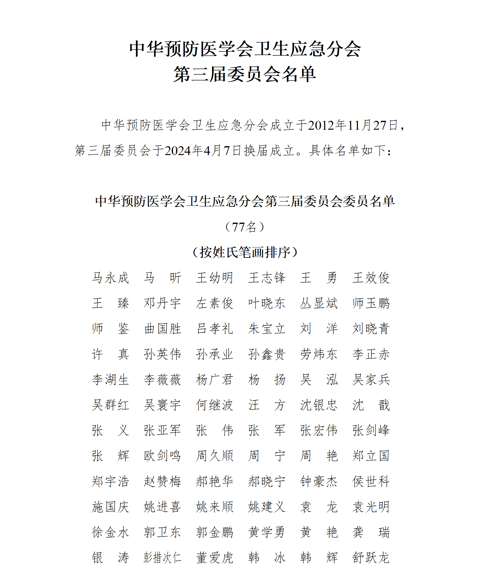 2024年4月7日,卫生应急分会第三届委员会合影